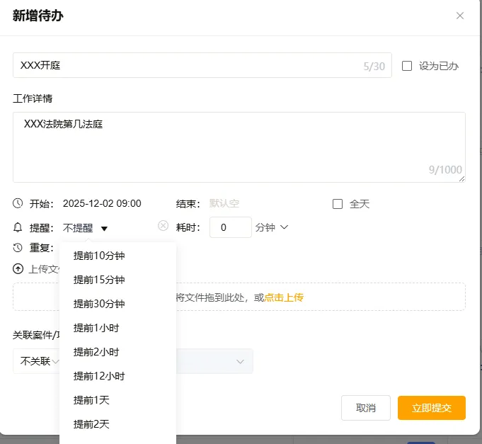 同时,可根据实际需求灵活设置提前提醒时间,从提前10分钟到提前2天不等,系统会通过微信及时推送提醒,确保无论身处何地、使用何种设备,都能随时查看行程,彻底杜绝遗漏开庭或重要工作安排的情况。