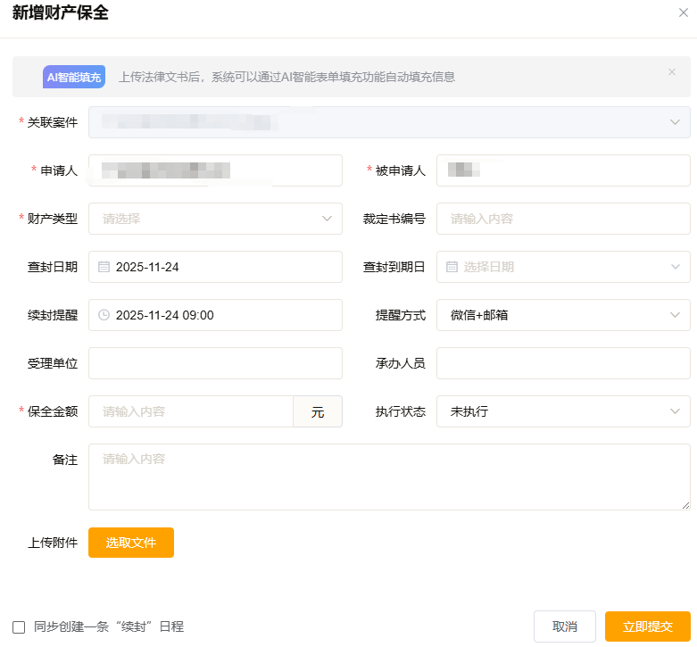 案件云的财产保全管理功能可精准应对这一需求,支持登记关联案件、申请人与被申请人信息、财产类型、查封日期、保全金额等关键内容,还能通过AI智能表单填充功能简化信息录入。