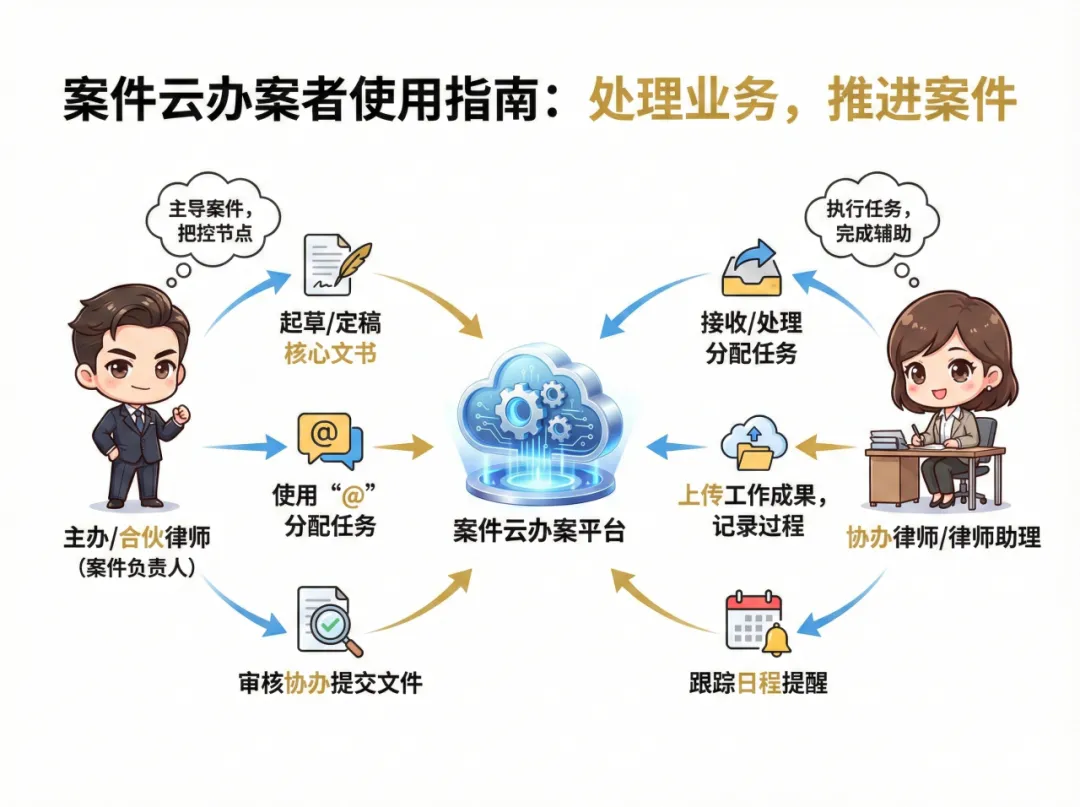 核心操作:把控案件所有核心文书与关键节点;在系统内分配、跟踪并审核各项任务。