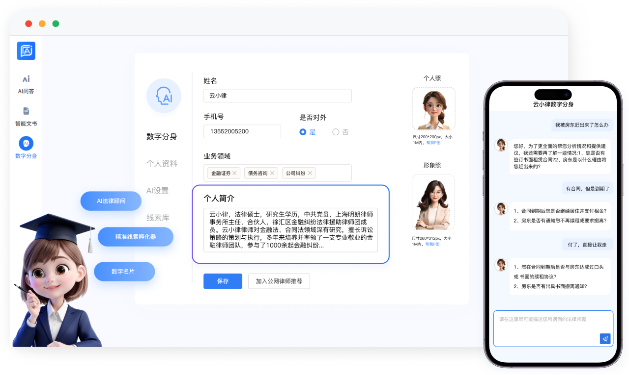 我们将AI Agent与数字名片相结合,为您量身打造了专属的AI数字分身——lawEos AI。它不仅是一款名片,更是一款「案源收割机」。全天候响应、精准筛选线索,助您高效开拓案源,实现案源转化。
