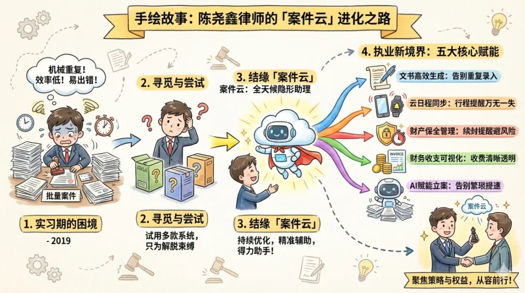我于2018年踏入律师行业,2019年进入实习律师阶段,2020年正式执业至今。实习期间,因带教师父承办大量批量性系列案件,需反复进行机械性的文书录入与案件台账管理工作。为提升效率、保障工作质量,我先后试用了多款律师案件管理系统,最终选定"案件云"并沿用至今。