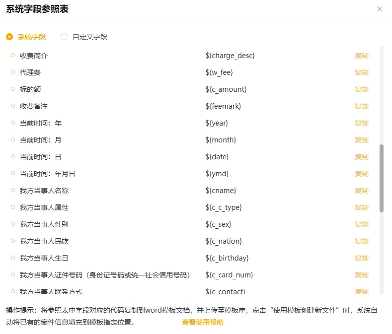 案件云的文书模板功能彻底解决了这一痛点。通过系统字段参照表或自定义字段功能,可将当事人名称、联系方式、标的额等常用信息设置为固定字段代码。