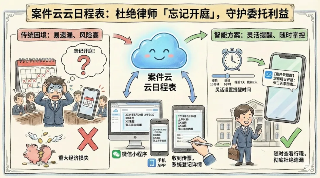 相较于传统纸质日历或手机自带日历的登记方式,案件云的云日程表更贴合律师工作需求。