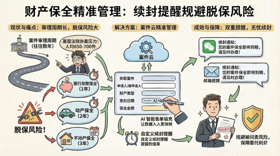 律师手头案件类型繁杂、所处阶段各异,若未能妥善管理保全情况,极易出现"脱保"问题。