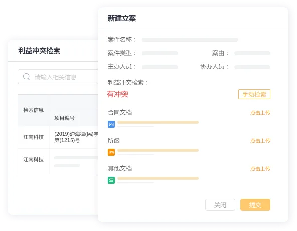 核心场景:在新项目立项前,于系统中一键发起"利益冲突检索",自动比对全所历史客户与案件,快速出具检索报告,将风险阻断在第一步。